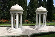 He commissioned two marble monuments to be built made in Corinthian style from Italy.[37] After successfully transferring the remains, Shoghi Effendi reburied the two next to each other in a ceremony on Christmas Day of 1939.[37] The burial ground is now called the Monument Gardens the burial ground of the Baháʼí "holy family" namely the wife, son, daughter and daughter-in-law of Baháʼu'lláh.[37]