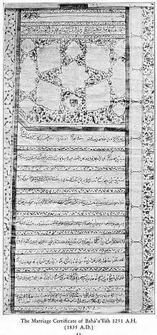 In October 1835, the fifteen-year-old Ásíyih Khánum married Baháʼu'lláh in a grand and sumptuous ceremony with the buttons on Ásíyih Khánum's clothes as jewels,[2][4] these jewels were later sold to provide for food for the family during the persecution of Bábís in 1852.[2][9] The early years of the marriage were apparently happy, according to Baháʼí texts, living a life of luxury; with Ásíyih and Baháʼu'lláh occupying themselves with philanthropy though naturally Ásíyih only helped the women and young children.[2][9] The marriage resulted in seven children: Kázim,[11] Sádiq,[11] ʻAbbás,[11] ʻAlí-Muhammad,[11] Bahíyyih,[11] Mihdí[11] and ʻAlí-Muhammad.[11][12] Only three survived to adulthood all of whom were deeply loyal to their mother.[13] Ásíyih Khánum was very close to her children, and took active participation in their upbringing especially ʻAbdu'l-Bahá.[9]