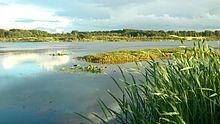 At Aarhus's location, the Bay of Aarhus provides a natural harbour with a depth of 10 m (33 ft) quite close to the shore.[36] Aarhus was founded at the mouth of a brackish water fjord, but the original fjord no longer exists, as it has gradually narrowed into what is now the Aarhus River and the Brabrand Lake, due to natural sedimentation. The land around Aarhus was once covered by forests, remains of which exist in parts of Marselisborg Forest to the south and Riis Skov to the north.[84][85] Several lakes extend west from the inner city as the landscape merges with the larger region of Søhøjlandet with heights exceeding 152 metres (499 ft) at Himmelbjerget between Skanderborg and Silkeborg.[86] The highest natural point in Aarhus Municipality is Jelshøj at 128 metres above sea level, in the southern district of Højbjerg. The hilltop is home to a Bronze Age barrow shrouded in local myths and legends.[87]