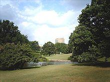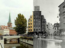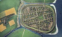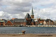 The centre of Aarhus was once a pagan burial site until Aarhus's first church, Holy Trinity Church, a timber structure, was built upon it during the reign of Frode, King of Jutland, around 900.[24] In the 900s an earth rampart for the defence of the early city was constructed, encircling the settlement, much like the defence structures found at Viking ring fortresses elsewhere. The rampart was later reinforced by Harald Bluetooth, and together with the town's geographical placement, this suggests that Aros was an important trade and military centre. There are strong indications of a former royal residence from the Viking Age in Viby, a few kilometres south of the Aarhus city centre.[25][26]