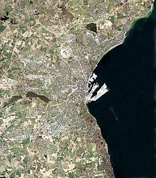 In 1838, the electoral laws were reformed leading to elections for the 15 seats on the city council. The rules were initially very strict allowing only the wealthiest citizens to run. In the 1844 elections only 174 citizens qualified out of a total population of more than 7,000.[38] The first city council, mainly composed of wealthy merchants and industrialists, quickly looked to improve the harbour, situated along the Aarhus River. Larger ships and growing freight volumes made a river harbour increasingly impractical. In 1840, the harbour was moved to the coast, north of the river where it became the largest industrial harbour outside Copenhagen over the following 15 years. From the outset, the new harbour was controlled by the city council, as it is to this day.[39]