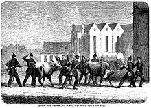 During the First Schleswig War Aarhus was occupied by German troops from 21 June to 24 July 1849. The city was spared any fighting, but in Vejlby north of the city a cavalry skirmish known as Rytterfægtningen took place which stopped the German advance through Jutland.[40] The war and occupation left a notable impact on the city as many streets, particularly in Frederiksbjerg, are named after Danish officers of the time. Fifteen years later, in 1864, the city was occupied again, this time for seven months, during the Second Schleswig War.[41][42]