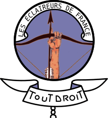 The bow and arrow were chosen as emblems by the founders of the Eclaireurs de France in 1911. The trefoil is for the girls and women. The four colours (orange, green, red, blue) represent the four age groups.[1]