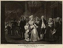 On 17 May 1778, after the visit of the court to Marly, Madame Élisabeth formally left the children's chamber and became an adult when she, upon the wish of the king her brother, was turned over to the king by her governess and given her own household, with Diane de Polignac as maid of honour and the Bonne Marie Félicité de Sérent as lady-in-waiting.[9] The ceremony was described: "Mme Elizabeth accompanied by the Princesse de Guéménée, the under governesses, and the ladies in attendance, went to the King's apartments, and there Mme de Guéménée formally handed over her charge to His Majesty, who sent for Mme la Comtesse Diane de Polignac, maid of honour to the Princess and Mme la Marquise de Sereat, her lady-in-waiting, into whose care he gave Mme Elizabeth."[6]