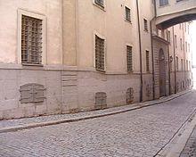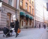 Like Västerlånggatan, Österlånggatan used to pass outside of the city walls and was for many centuries one of the city's major streets. (See Västerlånggatan for more details.) When Skeppsbron, the broad street and quay running to the east of Österlånggatan, was created during the 17th century, Österlånggatan lost much of the importance it used to have.[1] Compared to Västerlånggatan, Österlånggatan is today a relatively quiet street notwithstanding the many restaurants and shops, in sharp contrast to the neighbourhood when the street formed the backyard of the dock district, crowded with sailors, taverns, travellers, and traders.[2]