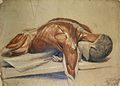 An écorché (French pronunciation: [ekɔʁʃe]) is a figure drawn, painted, or sculpted showing the muscles of the body without skin, normally as a figure study for another work or as an exercise for a student artist. The Renaissance-era architect, theorist and all-around Renaissance man, Leon Battista Alberti, recommended that when painters intend to depict a nude, they should first arrange the muscles and bones, then depict the overlying skin.[1]