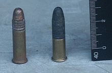 American cartridge manufacturer Union Metallic Cartridge Company most likely introduced the .22 Long Rifle cartridge as early as 1884.[4] The round owes its origin to the .22 BB Cap of 1845 and the .22 Short of 1857. It combined the case of the .22 Long of 1871 with a 45 grains (2.9 g) bullet, giving it a longer overall length, a higher muzzle velocity and superior performance as a hunting and target round, rendering the .22 Extra Long cartridges obsolete. The .22 LR uses a heeled bullet, which means that the bullet is the same diameter as the case, and has a narrower "heel" portion that fits in the case. It is one of the few cartridges that are accepted by a large variety of rifles and handguns.