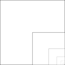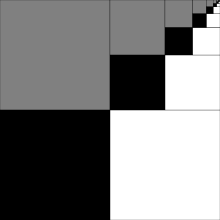 In the figure on the left,[2][3] if the large square is taken to have area 1, then the largest black square has area 1/2 × 1/2 = 1/4. Likewise, the second largest black square has area 1/16, and the third largest black square has area 1/64. The area taken up by all of the black squares together is therefore 1/4 + 1/16 + 1/64 + ⋯, and this is also the area taken up by the gray squares and the white squares. Since these three areas cover the unit square, the figure demonstrates that