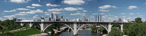 The 10th Avenue Bridge crosses the Mississippi River near downtown Minneapolis, Minnesota and also in proximity to the University of Minnesota. The bridge was formerly called the Cedar Avenue Bridge from days prior to the construction of the I-35W bridge when it connected to Cedar Ave. The bridge connects 10th Avenue Southeast, on the east side of the Mississippi River to 19th Avenue South, on the west side. The bridge is considered the crowning achievement of Minneapolis city engineer Kristoffer Olsen Oustad, who was one of four prominent Norwegian-American men who designed major structures in the region.[2] It was added to the National Register of Historic Places in 1989, and also marks the downstream boundary of the Saint Anthony Falls Historic District. During the days immediately following the I-35W bridge collapse, the 10th Avenue Bridge was closed to traffic, then later reopened; it was one of the most used locations from which to view the wreckage and the recovery efforts.