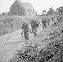 The Second World War was declared on Sunday, 3 September 1939 and the two Territorial Army battalions, the 4th and the 6th (a duplicate of the 4th), were called-up immediately. The 2nd Battalion embarked for France with the 9th Infantry Brigade attached to the 3rd Infantry Division commanded by Major-General Bernard Montgomery in October 1939.[49] They were followed by the 6th Battalion, part of 138th Brigade with the 46th Infantry Division, in April 1940; both served with the British Expeditionary Force (BEF) and managed to return from Dunkirk after the battles of France and Belgium.[50] After returning to England, both battalions spent years in the United Kingdom on home defence anticipating a possible German invasion of the United Kingdom.[51] The 2nd Battalion, remaining with the same brigade and division throughout the war, then spent the next four years training in various parts of the United Kingdom before taking part in the D-Day landings in June 1944. The battalion, commanded by Lieutenant Colonel Christopher Welby-Everard was then engaged throughout the Normandy Campaign, taking part in Operation Charnwood, Operation Goodwood, and throughout the rest of the Northwest Europe Campaign until Victory in Europe Day in May 1945.[52]
