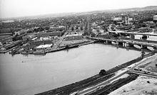 In 1820, the privately owned "Upper Navy Yard Bridge" was built over the Anacostia River at 11th Street SE.[7][8] Also a toll bridge, this second bridge became a "free" bridge in 1848 after it was purchased by the federal government.[7] From the city's founding until 1854, the area known today as Anacostia was primarily sparsely populated farmland.[8] But Anacostia was platted in 1854, and development slowly began to turn the agricultural land into businesses and residences.[8] The destruction of the Eastern Branch Bridge in 1846, however, significantly slowed growth in the area for five decades.[10]