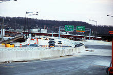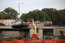 The first bridge at the site, constructed about 1800, played a role in the War of 1812. It burned in 1846, but was repaired. A second bridge was constructed in 1873, and replaced in 1907. A modern, four-lane bridge replaced the older bridge in 1965, and a second four-lane bridge added in 1969.[2] In 2009, construction began on three spans (two carrying freeway traffic, one carrying local-only traffic) to replace the 1965 and 1969 bridges. The northbound bridge opened to traffic in December 2011 while the southbound bridge open to traffic in January 2012. The new bridges include new ramps and new interchanges with I-295 (the Anacostia Freeway). The local bridge opened to traffic in May 2012. Portions of all three bridges and their approaches remain under construction as of April 2013. Phase 1 of the project was completed ahead of schedule and within budget in July 2013.[3] The local bridge was fully complete by September 2013.[4] Phase 2 of the project, including the conversion of the Barney Circle Freeway into a boulevard,[5] was completed in 2015.