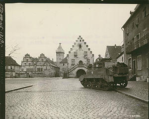 In a quick drive to the Rhine, Ludwigshafen fell on 21 March, and two other important river cities, Speyer and Germersheim, were secured on 24 March, clearing the Saar Palatinate. Maintaining the rapid pace, the 12th crossed the Rhine River at Worms on 28 March over pontoon bridges, advanced toward Würzburg, and captured that city along with elements of the famed 42nd Infantry Division (United States).[22][23] After assisting in the seizure of Schweinfurt, the division continued toward Nuremberg on 13 April, taking Neustadt, then shifted south toward Munich on 17 April. Elements of the 12th raced from Dinkelsbühl to the Danube, where they found the bridge at Lauingen had been blown.[24] Moving quickly they captured the bridge at Dillingen intact before demolition men could destroy it. This bridge provided a vital artery for Allied troops flooding into southern Bavaria.[25]