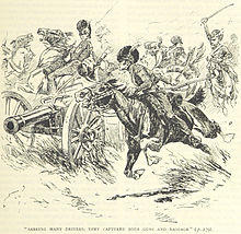 In February 1810 the regiment sailed for Lisbon for service in the Peninsular War.[10] It took part in the Battle of Campo Maior on the Spanish-Portuguese border on 25 March 1811 in a clash that occurred between British and Portuguese cavalry, under Robert Ballard Long, and a force of French infantry and cavalry under General Latour-Maubourg. The regiment, two and a half squadrons strong, led by Colonel Michael Head, charged and routed a superior French cavalry force of no less than six squadrons.[11] The regiment, with two Portuguese squadrons, then went on to pursue the French for seven miles to the outskirts of Badajoz.[12] The report reaching Lord Wellington seems to have glossed over the epic quality of the charge and emphasised the overlong pursuit. After receiving Marshal Beresford's report, Wellington issued a particularly harsh reprimand to the regiment calling them "a rabble" and threatening to remove their horses from them and send the regiment to do duty at Lisbon. The officers of the regiment then wrote a collective letter to Wellington detailing the particulars of the action. Wellington is reported as saying that had he known the full facts he would never have issued the reprimand.[13] The historian Sir John Fortescue wrote, "Of the performance of Thirteenth, who did not exceed two hundred men, in defeating twice or thrice their numbers single-handed, it is difficult to speak too highly."[14]