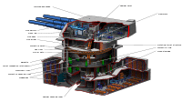 These guns were 50 calibers long—or 50 times their 16-inch (406 mm) bore diameter, which makes the barrels 66.6 ft (20.3 m) long, from chamber to muzzle. Each gun weighed about 239,000 lb (108,000 kg) without the breech, and 267,900 lb (121,500 kg) with the breech.[1] They fired projectiles weighing from 1,900 to 2,700 lb (860 to 1,220 kg) at a maximum speed of 2,690 feet per second (820 m/s) with a range of up to 24 mi (39 km). At maximum range the projectile spent almost 1½ minutes in flight. Each turret required a crew of 79 men to operate. The turrets themselves cost US$1.4 million each, to which the cost of the guns had to be added.[1]