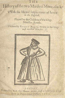 Title page of Robert Armin's The History of the two Maids of More-Clacke. The woodcut shows Armin onstage.
