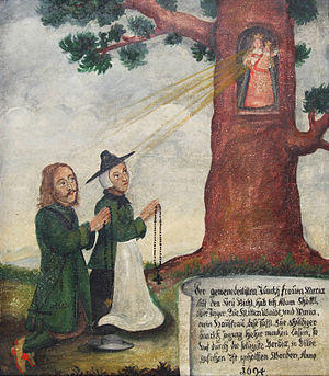 unknown artist, Votive tablet from the Heuwinkl Chapel in Iffeldorf. It depicts the Virgin Mary's image placed in a hollow oak tree which was the destination of many pilgrims
