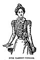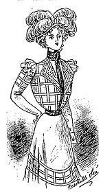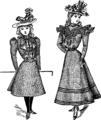 Unfussy, tailored clothes, adapted from the earlier theme of men's tailoring and simplicity of form, were worn for outdoor activities and traveling.[3] The shirtwaist, a costume with a bodice or waist tailored like a man's shirt with a high collar, was adopted for informal daywear and became the uniform of working women. Walking suits featured ankle-length skirts with matching jackets. The notion of "rational dress" for women's health was a widely discussed topic in 1891, which led to the development of sports dress. This included ample skirts with a belted blouse for hockey. In addition, cycling became very popular and led to the development of "cycling costumes", which were shorter skirts or "bloomers" which were Turkish trouser style outfits. By the 1890s, women bicyclists increasingly wore bloomers in public and in the company of men as well as other women. Bloomers seem to have been more commonly worn in Paris than in England or the United States and became quite popular and fashionable. In the United States, bloomers were more intended for exercise than fashion. The rise of American women's college sports in the 1890s created a need for more unencumbered movement than exercise skirts would allow. By the end of the decade, most colleges that admitted women had women's basketball teams, all outfitted in bloomers.[4] Across the nation's campuses, baggy bloomers were paired with blouses to create the first women's gym uniforms.[5]