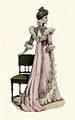 The 1890s in both Europe and North America saw growing acceptance of artistic or aesthetic dress as mainstream fashion influenced by the philosophies of John Ruskin and William Morris.[8] This was especially seen in the adoption of the uncorseted tea gown for at-home wear. In the United States during this period, Dress, the Jenness Miller Magazine (1887–1898) [1], reported that tea gowns were being worn outside the home for the first time in fashionable summer resorts.