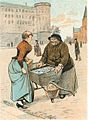 High tab front shoes with a large buckle had made a comeback in the 1870s and were again revived in the 1890s. This popular style of shoe had a few names such as "Cromwell," "Colonial," and "Molière".[9] At this time materials such as suede, leather, lace and metal were used to fashion the shoe and decorate it. Suede was new to the market in 1890 and was available in a few pale shades.