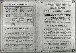 The 1894 Wimbledon Championships took place on the outdoor grass courts at the All England Lawn Tennis Club in Wimbledon, London, United Kingdom. The tournament ran from 9 July until 18 July.[1] It was the 18th staging of the Wimbledon Championships, and the first Grand Slam tennis event of 1894.[2]