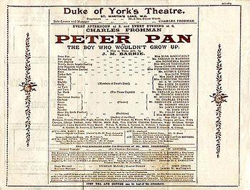 - J. M. Barrie's play Peter Pan, or The Boy Who Wouldn't Grow Up premières at the Duke of York's Theatre in London[8] with Nina Boucicault in the title rôle and Gerald du Maurier as Captain Hook and Mr Darling; du Maurier is the uncle of the Llewellyn Davies boys, who inspired the story.