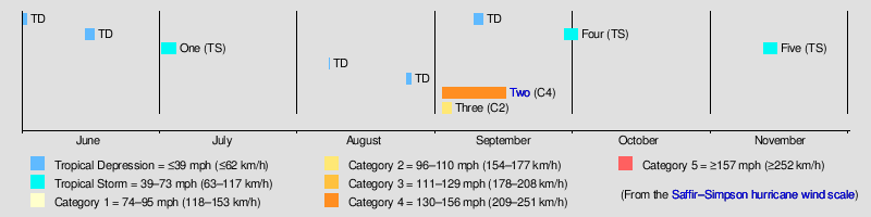 The season's activity was reflected with an accumulated cyclone energy (ACE) rating of 55.[1] ACE is, broadly speaking, a measure of the power of the hurricane multiplied by the length of time it existed, so storms that last a long time, as well as particularly strong hurricanes, have high ACEs. It is only calculated for full advisories on tropical systems at or exceeding 39 mph (63 km/h), which is tropical storm strength.[2]