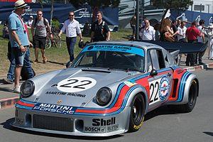 After a successful foray into the Can-Am scene, Porsche returned to Sports-car racing this year. The Martini-sponsored works team bought the evolution of the Carrera RSR. It was now powered by a new 2142cc flat-6 engine, augmented by the exhaust-driven KKK (Kühnle, Kopp & Kausch[13]) turbo used in their Can-Am cars, that pushed out 490 bhp (and was equivalent to 2999cc using the x1.4 equivalency). It also featured improved aerodynamics (front spoiler, wider wheel arches, full rear wing) and upgraded transmission and braking which all made them slightly quicker than the Matras in a straight line.[14][12] The two cars were driven by Gijs van Lennep/Herbert Müller and Manfred Schurti/Helmuth Koinigg. There were also older Porsches in the Group 5 field: including a non-turbo RSR special from Mexican Héctor Rebaque and two 908/02s returning from the previous year run by Swiss André Wicky and Ecuadorian Guillermo Ortega.