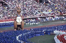 Once her lap was completed, her pouch opened and children representing joey kangaroos ran out towards small trampolines which had been set up in the centre of the stadium. As they bounced, Rolf Harris, standing on the tray of a small truck wearing a sky blue leisure suit and with his trademark wobble board, performed a special version of "Tie Me Kangaroo Down" which included the added lyrics: