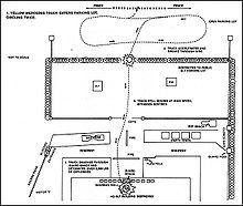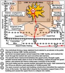 At around 06:22, a 19-ton yellow Mercedes-Benz stake-bed truck drove to the Beirut International Airport. The 1st Battalion 8th Marines (BLT), commanded by Lieutenant Colonel Larry Gerlach, was a subordinate element of the 24th MAU. The truck was not the water truck they had been expecting. Instead, it was a hijacked truck carrying explosives. The driver turned his truck onto an access road leading to the compound. He drove into and circled the parking lot, and then he accelerated to crash through a 5-foot-high barrier of concertina wire separating the parking lot from the building. The wire popped "like somebody walking on twigs."[37] The truck then passed between two sentry posts and through an open vehicle gate in the perimeter chain-link fence, crashed through a guard shack in front of the building and smashed into the lobby of the building serving as the barracks for the 1st Battalion 8th Marines (BLT). The sentries at the gate were operating under rules of engagement which made it very difficult to respond quickly to the truck. On the day of the bombing, the sentries were ordered to keep a loaded magazine inserted in their weapon, bolt closed, weapon on safe and no round in the chamber. Only one sentry, LCpl Eddie DiFranco, was able to chamber a round. However, by that time the truck was already crashing into the building's entryway.[38]