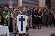 On June 6, 1982, the Israel Defense Forces (IDF) initiated Operation "Peace for Galilee" and invaded Lebanon in order to create a 40 km buffer zone between the PLO and Syrian forces in Lebanon and Israel.[17][18][19] The Israeli invasion was tacitly approved by the U.S., and the U.S. provided overt military support to Israel in the form of arms and materiel.[20] The U.S.' support for Israel's invasion of Lebanon taken in conjunction with U.S. support for Lebanese President Bachir Gemayel and the Lebanese Armed Forces (LAF) alienated many.[21] Bachir Gemayel was the legally elected president, but he was a partisan Maronite Christian and covert associate of Israel.[22] These factors served to disaffect the Lebanese Muslim and Druze communities. This animosity was made worse by the Phalangist, a right-wing, largely Maronite-Lebanese militia force closely associated with President Gemayel. The Phalangist militia was responsible for multiple, bloody attacks against the Muslim and Druze communities in Lebanon and for the 1982 atrocities committed in the PLO refugee camps, Sabra and Shatila by Lebanese Forces (LF), while the IDF provided security and looked on.[23][24] The Phalangist militia's attacks on Sabra and Shatila were purportedly a response to the September 14, 1982, assassination of President-elect Bachir Gemayel.[23][25][26] Amine Gemayel, Bachir's brother, succeeded Bachir as the elected president of Lebanon, and Amine continued to represent and advance Maronite interests.