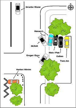 Around 9:30 a.m., agents Grogan and Dove spotted the suspect vehicle, and began to follow. Two other stakeout team cars joined them, and eventually an attempt was made to conduct a traffic stop of the suspects, who were forced off the road following collisions with the cars of FBI agents Grogan/Dove, agents Hanlon/Mireles, and agent Manauzzi. These collisions sent the suspect car nose first into a tree in a small parking area in front of a house at 12201 Southwest 82nd Avenue, pinned between a parked car (on its passenger side) and Manauzzi's car on the driver side.[1]