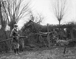 The 1st Field Regiment was formed in 1914 following the outbreak of World War I, designated as the "1st Field Artillery Brigade".[1] The brigade saw action on the Gallipoli Peninsula in 1915, supporting the British 29th Division around Cape Helles from early May, and then the Australian 2nd Division around Anzac Cove from October until the force was withdrawn back to Egypt. From mid-1916, the brigade supported the 1st Division on the Western Front until the end of the war in November 1918.[2] During this time, the regiment consisted of the following: the 1st Field Artillery Battery, 2nd Field Artillery Battery, 3rd Field Artillery Battery, 101st Field Artillery (Howitzer) Battery and the 1st Brigade Ammunition Column.[3]