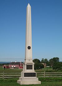 At a dire moment on the afternoon of July 2, 1863, Major General Winfield Scott Hancock, commander of II Corps ordered the 1st Minnesota to charge into a Southern brigade of roughly 1200 men of James Longstreet's corps and Richard H. Anderson's Division, which it did with roughly 250 men. They were outnumbered by at least 5 to 1, but it was Gen. Hancock's only option to buy time for reinforcements to arrive. One survivor stated afterward that he expected the advance to result in "death or wounds to us all..."[2] The regiment immediately obeyed the order and Gen. Hancock was amazed at the unit discipline, valor, and the tremendous casualties taken in carrying out his order. This action blunted the Confederate attack and helped preserve the Union's precarious position on Cemetery Ridge at the end of the second day of the battle.