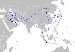 The relay itself started on 8 October 2006 with a brief ceremony at the Doha Golf Club where the torch was lit with a flame named "Flame of Hospitality".[30][31][32] With the involvement of over 3,000 people, the torch crossed eight former Asian Games host countries and four Gulf Cooperation Council member states. The torch travelled back to Doha held by Sheikh Joan Bin Hamad Al-Thani, and the journey around the city itself started on 25 November 2006 and lasted until the opening ceremony of the Games.[33][34] The first pit stop was in New Delhi, the birthplace of the Asian Games on 11 October 2006 where the torch's flame was fused together with the Eternal Asian Games Flame at the Dhyan Chand National Stadium.[35] During the fourth stop in Hiroshima on 21 October, the torch's flame was fused together with the Peace flame at the Hiroshima Peace Memorial Park.[36] In total the relay passed through 13 countries and 23 cities, visited several landmarks such as Taj Mahal and the Great Wall of China along its way.[37][38][39] The relay, which totaled a distance of 50,000 kilometres in 55 days, is the longest in the history of the Asian Games.[25]
