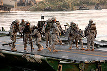 In November 2004 the brigade headquarters deployed to Camp Victory, Iraq in support of OIF 04-06. The brigade grew to a size of 6,100 personnel in of three brigade headquarters companies, seven battalions, six separate companies and nine detachments.[2] The brigade served as the Multi-National Corps – Iraq corps-level engineer headquarters for all echelon-above-division engineers in Iraq, providing command and control for general support combat and construction engineer missions across the country. During its deployment, the 20th Engineer Brigade patrolled 57,950 kilometers of roads for Improvised Explosive Devices, expanded 14 bases in support of the MNC-I basing plan; emplaced or maintained 16 bridges; expanded detention capacity for 6,000 detainees; trained over 53,000 coalition soldiers on explosives hazards awareness; reduced over 11,000 caches and over 80,000 tons of explosive munitions.[2] Other missions included repair of an airfield known as "Key West" by light equipment elements, support of the Long Range Surveillance Detachment, 313th Military Intelligence Battalion, 82nd Airborne Division based in Zakhu, located in Iraqi Kurdistan.[2] Another task for the Brigade was to assist British engineers in a systematic mapping of the entire nation and creating an Iraqi Geospatial Reference System, in order to make national reconstruction easier and more organized.[13] The 20th Brigade suffered at least one casualty during its tour in Iraq, with a soldier killed by an enemy Improvised Explosive Device on 22 August 2005 in Ad Dwar when an explosive device destroyed his vehicle.[14] During its deployment to Iraq, the Unit assumed command of several additional battalions from the Army National Guard, forcing existing formations of the unit to cope with additional responsibilities.[15] Seemingly elements of the 107th and 507th Engineer Battalions of the Michigan Army National Guard, the 30th Engineer Brigade (TA) of the North Carolina Army National Guard and the 194th Engineer Brigade of the Tennessee National Guard were part of the brigade.