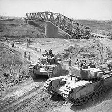 In August 1940, it began to receive modern Valentine I tanks, the first of what would be a continual change in tanks. Valentine IIs were received from April 1941 and the brigade had about a hundred Churchill tanks on strength by the end of the year.[3] The brigade lost 44th Royal Tank Regiment on 11 September 1940, but 43rd Royal Tank Regiment wasn't assigned until 9 November 1940. 42nd Royal Tank Regiment was transferred away on 12 April 1941 and 43rd Royal Tank Regiment was exchanged for 12th Royal Tank Regiment on 12 April 1941. 145th Regiment Royal Armoured Corps arrived on 15 November 1941. This left the brigade with 12th and 48th Royal Tank Regiment and the 145th Royal Armoured Corps, the units which it would keep for the bulk of the war. The brigade was redesignated as the 21st Tank Brigade on 6 June 1942 when it was assigned to the 4th Infantry Division as part of the British experiment with "Mixed Divisions".[4] A mixed division had one tank brigade with infantry tanks and two non-motorized infantry brigades; the idea being to better coordinate tank and infantry support.