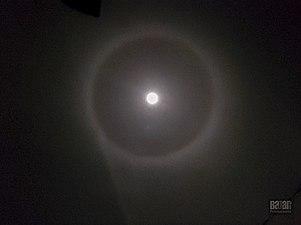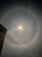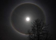 A 22° halo is an optical phenomenon that belongs to the family of ice-crystal halos. Its form is a ring with an apparent radius of approximately 22° around the Sun or Moon. When visible around the Moon, it is called a moon ring or winter halo. It forms as direct sunlight or moonlight is refracted in millions of hexagonal ice crystals suspended in the atmosphere.[1] The halo appears large; its radius is roughly the length of an outstretched hand at arm's length.[2] A 22° halo may be visible on as many as 100 days per year – much more frequently than rainbows.[3]