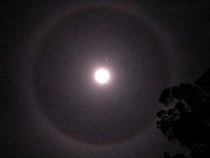 In folklore, moon rings are said to warn of approaching storms.[7] Like other ice halos, 22° halos appear when the sky is covered by thin cirrus or cirrostratus clouds that often come a few days before a large storm front.[8] However, the same clouds can also occur without any associated weather change, making a 22° halo unreliable as a sign of bad weather.