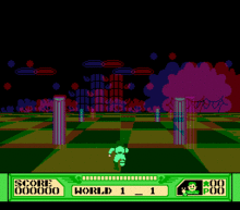 The 3-D Battles of WorldRunner (shortened to 3-D WorldRunner on the North American box art),[3] originally released in Japan as Tobidase Daisakusen[a], is a 1987 third-person rail shooter platform video game developed and published by Square for the Family Computer Disk System. It was later ported to cartridge format and published by Acclaim for the Nintendo Entertainment System.[4]
