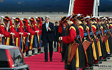Since 1991 the division has maintained a traditional guard of honour unit at the Gyeongbokgung in Seoul to perform ceremonial duties, such as welcoming heads of state and changing of the guard. The unit performs a historical re-enactment of the ceremony and don traditional attire and weaponry. The unit was created after president Roh Tae-woo reviewed the Old Guard Fife and Drum Corps and the Commander-in-Chief's Guard of the 3rd U.S. Infantry Regiment during his visit to the White House that year and decided that the Korean Army should have a unit for similar functions. The first ceremony took place in 1996 after extensive research and consultation with historians and experts on details from commands used to accessories and attire worn.[5]