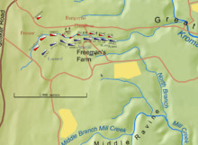 Under Scammell the 3rd regiment saw heated action at the Battles of Saratoga, as evidenced by the loss of several officers and many men.[17] It is remarkable, given the positioning of the 3rd Regiment on the battlefield at Freeman's Farm, that such an inexperienced unit was able to hold the middle of the field. The 3rd was also on the field, in the thick of the battle as part of Enoch Poor's brigade in the Battle of Bemis Heights.