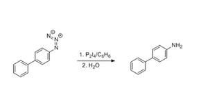 Like other aniline derivatives, 4-aminobiphenyl is weakly basic. It is prepared by reduction of 4-nitrobiphenyl, which, together with the 2-nitro derivatives, is obtained by nitration of biphenyl.[9] Another reaction to synthesize 4-aminobiphenyl can be obtained by using 4-azidobiphenyl. This can be done by reacting 4-azidobiphenyl with diphosphorus tetraiodide (P2I4), which can cleave the nitrogen-nitrogen bond. This reaction is done in benzene and later on, water is added to promote the formation of amine.