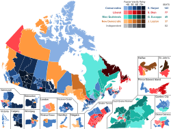 | Conservative | Stephen Harper | 307 | 124 | 127 | 143 | +12.6% | 46.4% | 5,209,069 | -165,002 | 37.65% | +1.38 | |