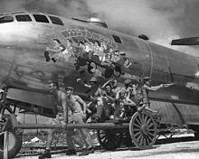 The group began operations on 28 October 1944 with a night attack against the submarine pens at Truk Island and attacks against Iwo Jima in early November.[14] The group took part in the first attack on Japan by AAF planes based in the Marianas.[13] On 24 November 1944 Major Robert Morgan led the first mission of the XXI Bomber Command to bomb Japan, with wing commander Brigadier Gen. Emmett O'Donnell, Jr. as co-pilot. 110 aircraft of the 73rd Bombardment Wing bombed Tokyo on this mission. The group also suffered its first combat loss on this mission, when a B-29 of the 870th squadron was shot down over the target area. However, this was not the first flight by a 497th aircraft to Japan. Major Morgan and his crew had flown a solo mission on 10 November using radio countermeasures equipment to obtain information on the disposition of Japanese early warning and gun control radars.[15] During December four group aircraft were destroyed in Japanese bombing raids against Isely Field.[16] The 497th flew missions against strategic objectives in Japan, originally in daylight and from high altitude.[13] It was also tasked with "Weather Strike" missions which were single ship flights flown nightly to obtain weather information for target areas in Japan while also making incendiary attacks on various targets.[17]