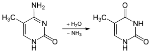 While spontaneous deamination of cytosine forms uracil, which is recognized and removed by DNA repair enzymes, deamination of 5-methylcytosine forms thymine. This conversion of a DNA base from cytosine (C) to thymine (T) can result in a transition mutation.[11] In addition, active enzymatic deamination of cytosine or 5-methylcytosine by the APOBEC family of cytosine deaminases could have beneficial implications on various cellular processes as well as on organismal evolution.[12] The implications of deamination on 5-hydroxymethylcytosine, on the other hand, remains less understood.