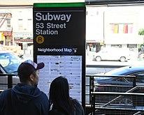 - ^ Cox, Jeremiah (June 9, 2009). "A 53 Street platform sign, text and a arrow for 52 St is painted beneath this one". subwaynut.com. Retrieved March 26, 2017.