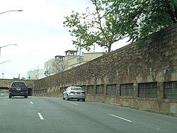 Construction on the line began in December 1928, and the whole line cost $58 million.[24] During the line's construction, several intersections of Queens Boulevard with major roads were grade separated, in a similar manner to Grand Concourse in the Bronx during the building of the IND Concourse Line around that same time.[15][25] At adjacent intersections with Woodhaven Boulevard and Horace Harding Boulevard (now the Long Island Expressway) in Elmhurst, Queens Boulevard's main road was depressed into underpasses.[25][26] In Kew Gardens, Union Turnpike and the Interboro Parkway (now the Jackie Robinson Parkway) were depressed below Queens Boulevard at the level of the Union Turnpike station's mezzanine.[27] From the mezzanine at Union Turnpike an entrance was built from the Interboro Parkway, allowing passengers from buses and automobiles to be dropped off here instead of from Queens Boulevard. The subway from Long Island City to Roosevelt Avenue and 74th Street was completed by April 1932.[21]
