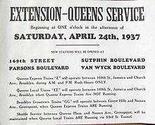 - ^ "Transit Link Open Today; 8th Ave. Line Extended to Jamaica—Celebration Arranged". The New York Times. April 24, 1937. ISSN 0362-4331. Retrieved August 4, 2016.
