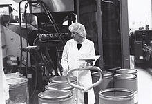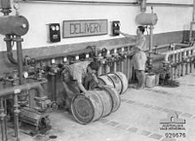 Henry Wehrhahn, employee of Nellie Bly's Iron Clad Manufacturing Company of New York, received two patents in December 1905 that would lead to the modern 55-gallon steel barrel.[4] Use of 200-litre drums became widespread in World War II, the first war in which trucks, cold rolled steel, stamp or pattern forging machinery and welding were widely available. They were first developed by the Axis powers (Germany and Italy), but were quickly adopted by Allies.[5] The drums helped win the Guadalcanal Campaign in the first U.S. offensive in the South Pacific Theater. The U.S. Navy could not maintain command of the sea long enough to offload aviation gasoline for aircraft ashore, so the drums were often transported to the island on fast ships, such as destroyers, and shoved over the sides (or, time permitting, lowered in cargo nets). Because gasoline's density is much less than that of water, the drums floated. Navy Seabees in small craft corralled the drums.